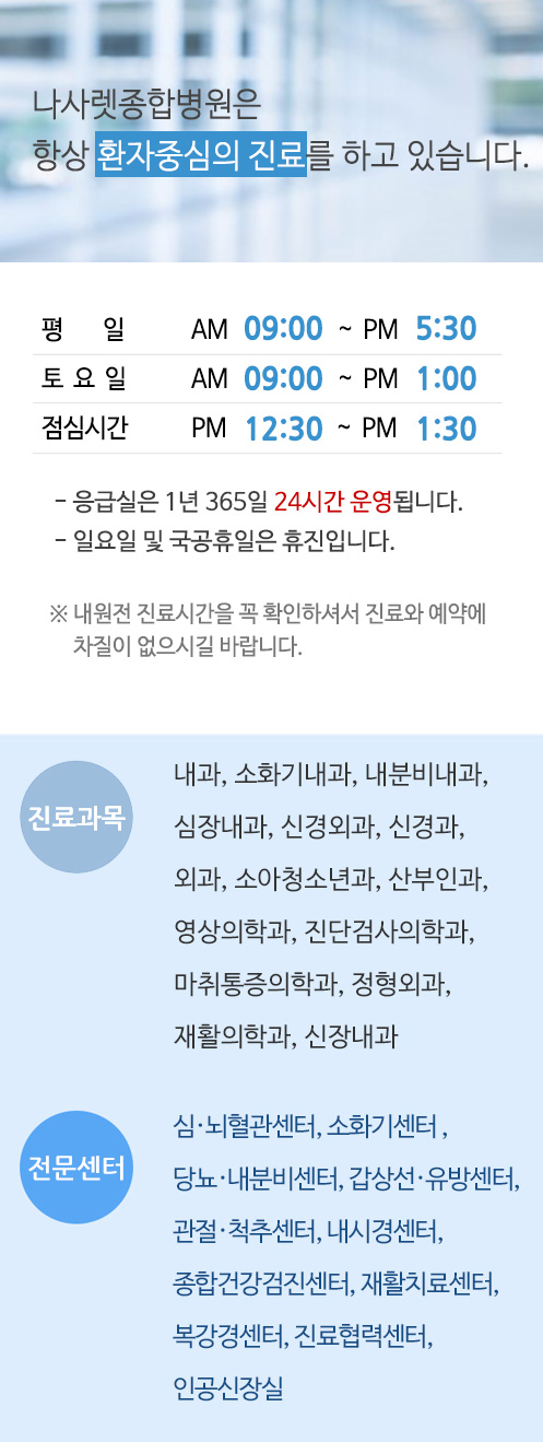 진료시간 나사렛종합병원 | 대표: 김대영 | 사업자번호: 503-90-59791 전화번호: 053-643-1400 | 팩스: 053-643-1405 주소: 대구광역시시 달서구 월배로 97(진천동) 메일: master@nazareth.co.kr Copyright 2020. NAZARETH ALL RIGHTS RESERVED.