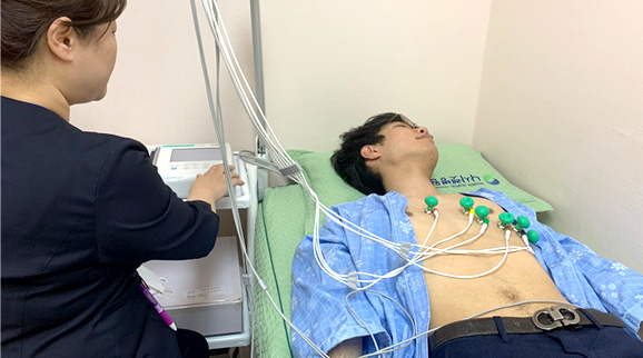 피부에 전극을 부착하여 심장박동과 관련된 전기적 신호를 감지하여 기록하는 것으로 심장의 리듬이 빠른지, 느린지, 불규칙한지 간편하고 신속하게 심장이상을 진단하는것에 유용하며, 심장에 대한 검사중 가장기본이 되는 검사방법입니다. ● 검사대상 가슴의 통증, 두근거림, 심장비대, 호흡곤란, 어지럼증 등 ● 검사방법 상의를 탈의하고 침대에 누워 팔과 다리, 가슴에 심전도 전극을 붙인후 1~2분간에 걸쳐 시행되고 통증은 없습니다. ![]() 운동부하검사