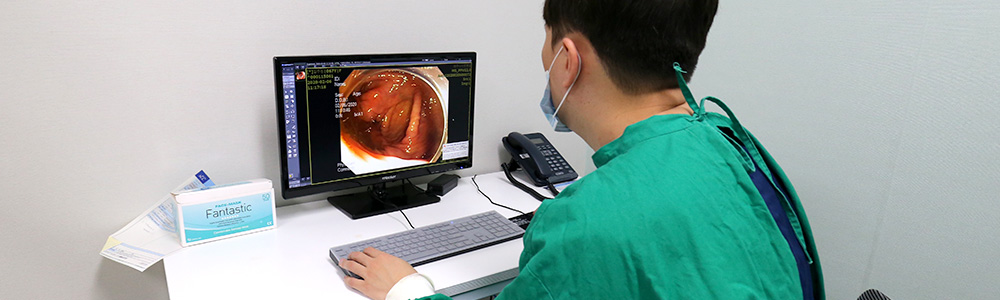 검사 직전 장운동 억제를 위한 주사를 맞고 위와 십이지장의 거품 제거제를 복용합니다.